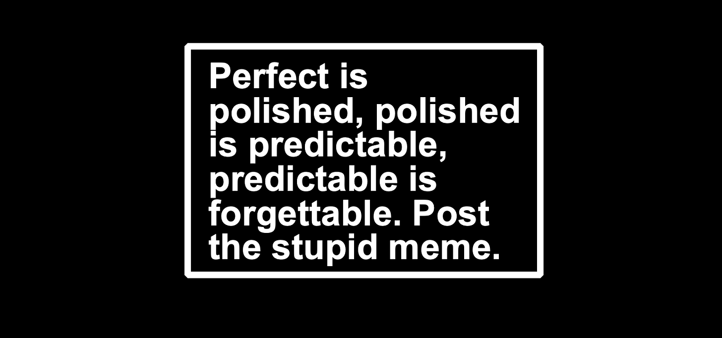 I recently gave a talk at MAD//Fest about how to make memes without being cringe. A few people have asked to see the presentation and I thought, finally, what a great excuse to stop posting on LinkedIn and start a Substack.
