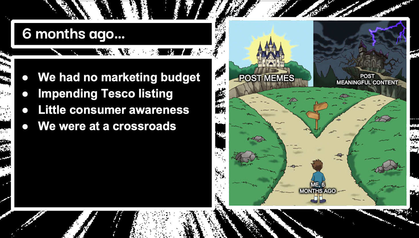 We created a very specific pen portrait. Dan, a 36 year old man who works in a creative industry who used to party too hard but has decided to mellow down a bit but still looks forward to the one vice and high in his life - coffee. He goes on social media for light entertainment and to have a laugh, and crucially, not to buy things. He’s basically me in a few years, and chances are, most brand owners are going to be speaking to people much like themselves. This makes things much easier because your task becomes answering the questions, “what do I genuinely find entertaining? What makes me laugh?”. This side-steps the dreaded trap that most CMOs and founders fall into: “what is expected from a brand like mine”.